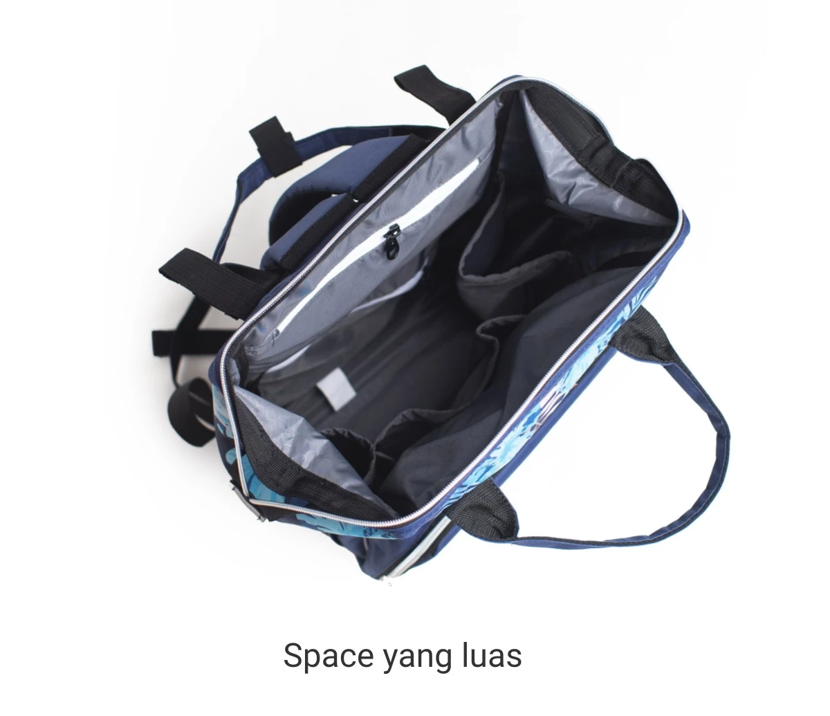 Terdapat ruang yang luas untuk menaruh barang-barang Anda. Pada bagian samping tas terdapat ruang untuk menyimpan botol minum / termos / botol susu. Bagian depan tas juga terdapat ruang untuk menyimpan barang yang di lengkapi dengan resleting. Pada bagian dalam terdapat kantung tambahan untuk menyimpan smartphone / dompet / tisue.